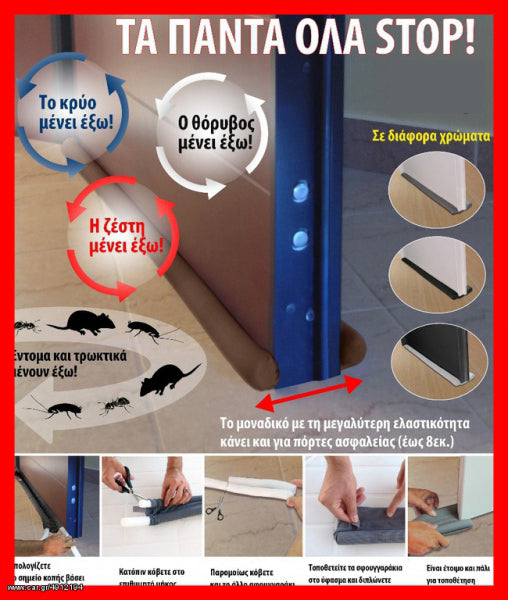Το διπλό αεροστόπ της εταιρείας Cosa τοποθετείται στο κάτω μέρος της πόρτας ή του παραθύρου και παραμένει σταθερό στη θέση του όταν ανοιγοκλείνετε. Η θήκη του ανοίγει έτσι ώστε να μπορείτε να κόψετε τον αφρό σε ότι μέγεθος θέλετεκαι να ξανά κλείσετε την θήκη. Αποτρέπει την είσοδο σκόνης, υγρασίας και το πέρασμα του αέρα. Σφραγίζει τα κενά και διατηρεί την εσωτερική θερμοκρασία, παρέχοντας μόνωση, εξοικονόμηση ενέργειας, αλλά και ηχομονωτική λειτουργία, καθώς απομονώνει θορύβους που προέρχονται από το εξωτερικό περιβάλλον και αντίστροφα. Παράλληλα προφυλάσσει από έντομα και τρωκτικά. Εφαρμόζει εύκολα και είναι ελαστικό.