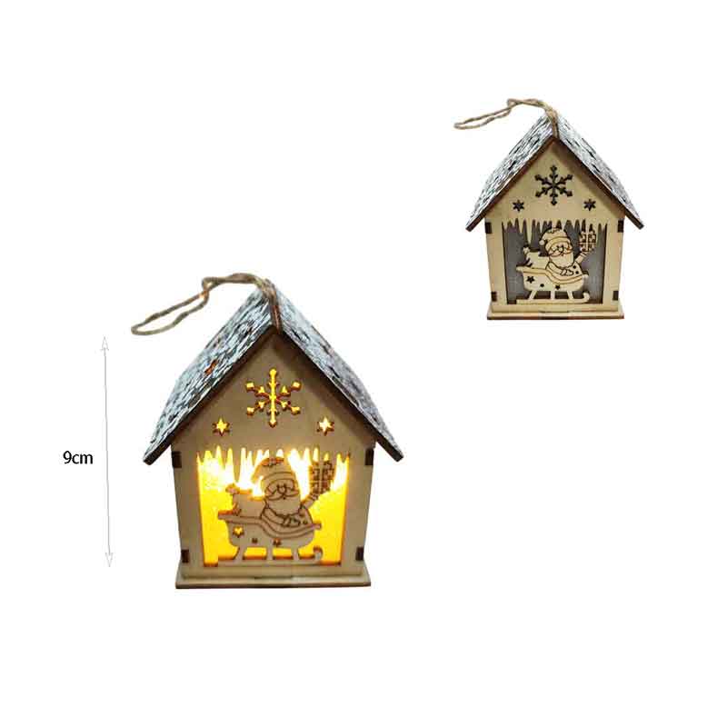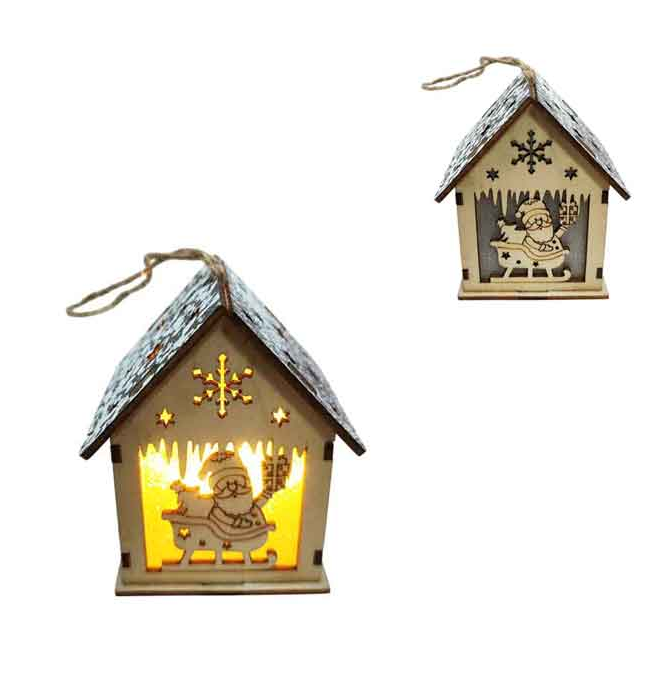 Ξύλινο χριστουγεννιάτικο σπιτάκι ύψους 9,5cm με φωτισμό LED (λειτουργεί με μπαταρία). Διακοσμημένο με Άγιο Βασίλη, έλατο και γιορτινές λεπτομέρειες, προσφέρει ζεστή και μαγική ατμόσφαιρα στο χώρο σας. Ιδανικό για το χριστουγεννιάτικο δέντρο, το τζάκι ή τη διακόσμηση τραπεζιού.