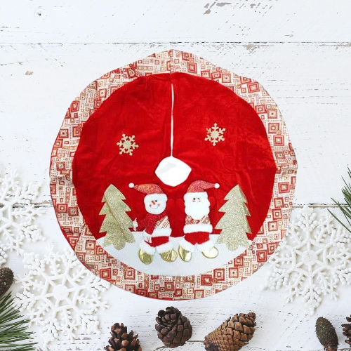 Υφασμάτινη χριστουγεννιάτικη ποδιά για το δέντρο, σε έντονο κόκκινο χρώμα με διακόσμηση Άγιο Βασίλη, δέντρα και χρυσές νιφάδες. Προσθέτει γιορτινή λάμψη και καλύπτει τη βάση του δέντρου με στυλ και κομψότητα. Διάμετρος: 95cm.