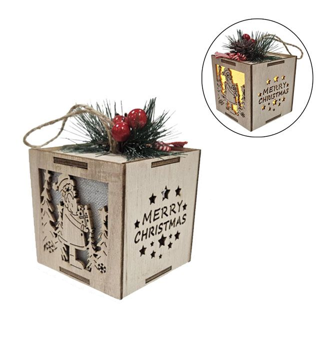 Ξύλινο χριστουγεννιάτικο φαναράκι με σχέδιο Άγιου Βασίλη και ευχές Merry Christmas. Διαθέτει ενσωματωμένο φωτισμό LED που δημιουργεί μια ζεστή και γιορτινή ατμόσφαιρα. Στολισμένο με κλαδάκι και μούρα στο επάνω μέρος, μπορεί να κρεμαστεί ή να τοποθετηθεί σε οποιοδήποτε σημείο του σπιτιού. Διαστάσεις 8x7cm. Ιδανικό για να συμπληρώσει τη χριστουγεννιάτικη διακόσμηση σας.