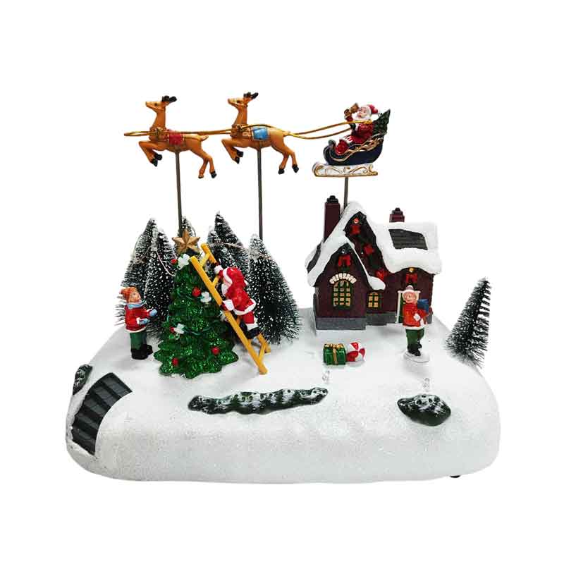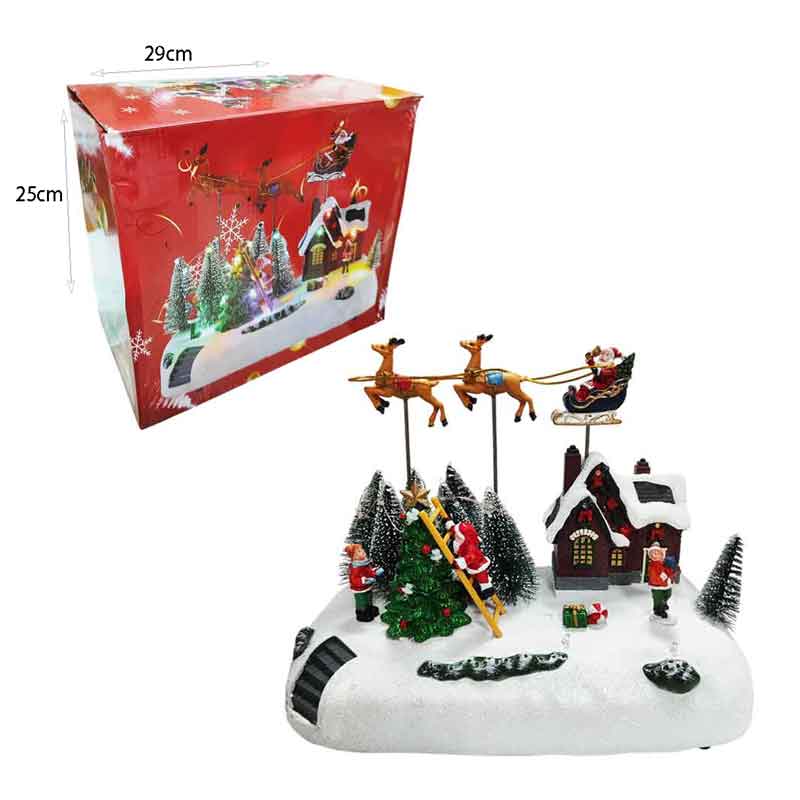 Εντυπωσιακό χριστουγεννιάτικο χωριό με φωτισμό LED και μουσική. Διαθέτει τον Άγιο Βασίλη με το έλκηθρο, ταράνδους και χιονισμένο τοπίο με σπιτάκια και δέντρα. Ιδανικό για διακόσμηση σαλονιού ή βιτρίνας, δημιουργεί μαγική γιορτινή ατμόσφαιρα. Διαστάσεις συσκευασίας: 29×25cm.